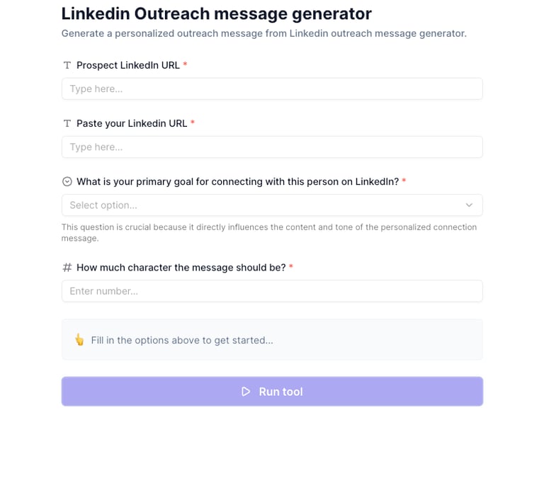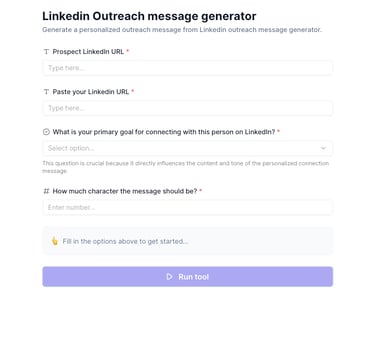 The LinkedIn Cold Message Generator simplifies the process of crafting tailored messages for connecting with prospects on LinkedIn. By answering a few straightforward questions, users can generate personalized outreach messages that resonate with their target audience and align with their connection goals.